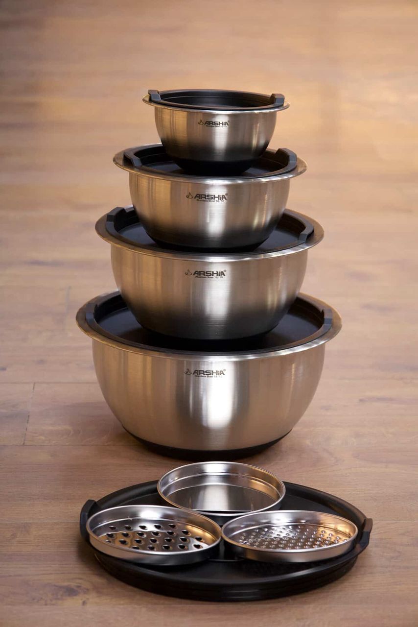⬅️شامل چهار عدد کاسه به همراه چهار درب هوابند در سایزهای: ۱۲، ۱۶، ۲۰ و ۲۴ سانت به علاوه یک درب چند منظوره ۲۴ سانتی و سه عدد رنده